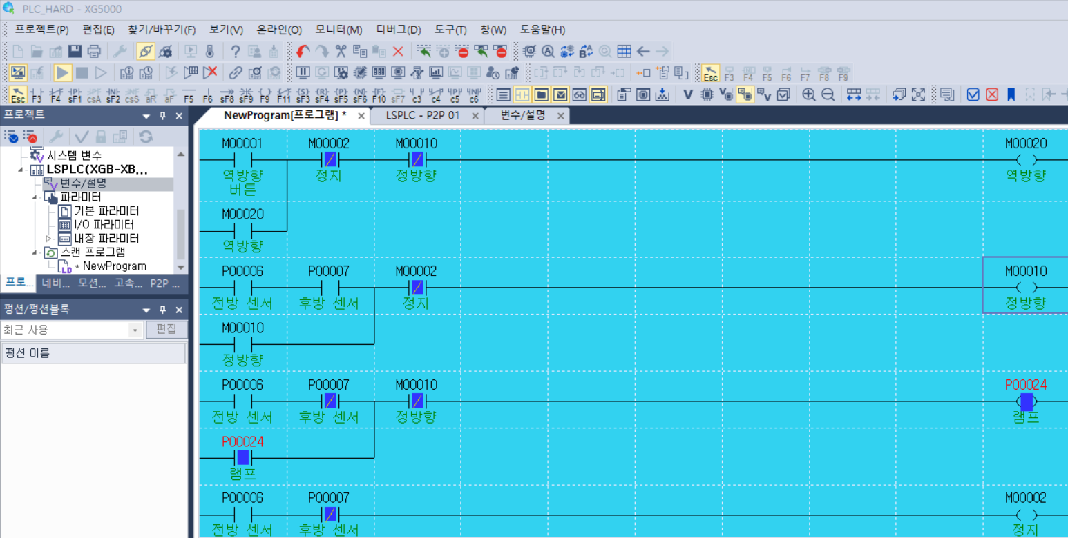 P0가 시작 P7이 정지버튼 M0가 켜지면서 자기 유지회로 그리고 P20불 들어옴