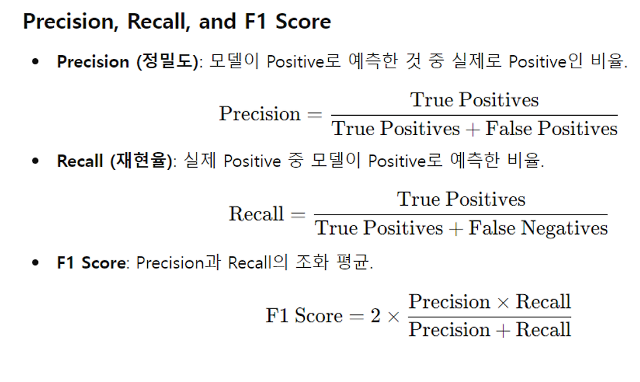 모델의 성능을 측정하는 데 있어 정밀도(Precision), 재현율(Recall), 그리고 **F1 점수(F1 Score)**는 중요한 지표입니다. 이 지표들은 특히 이진 분류 문제에서 모델의 성능을 평가하는 데 유용합니다.