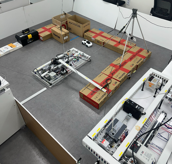 2024.08.13(화) 오늘은!!!PLC 마지막 정규수업이자최종 프로젝트날프로젝트 주제는RC카 경주장 만들기 강사님께서 간단하게프로젝트를 설명해주시고우리가 배운 모든 걸활용해라!!룰도 직접 만들어라트랙도 직접 제작해봐라팀별로 해도 좋고 반 전체가같이 만들어도 좋다 하셨습니다.시작시간 10:00마감시간은 14:00점심시간 포함해서4시간 안에다 만들어야 했습니다.이 프로젝트에서는아무래도 강사님께서창의력과 추진력,시간관리 능력을기르게끔해주신 것 같습니다.저희 반은 팀별로 하기엔너무 적고반별로 하기엔 너무 과해서앞열 2개 팀과뒷열 2개 팀으로 나눠서제작하였습니다.저희 앞열 2개 팀은 총 9명가산 C402 말고가산 C403이 비어서빈 강의실에서 진행했습니다. 빠른 경기장 제작을 위해PLC 보관하는 선반에 있던..
